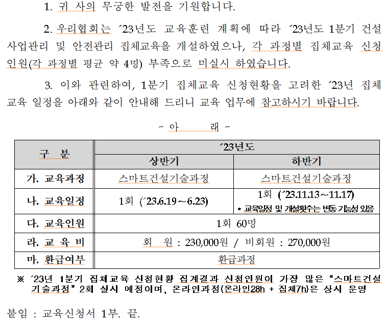 Çѱ¹°Ç¼³¿£Áö´Ï¾î¸µÇùȸ¿¡¼ ¾Ë·Áµå¸³´Ï´Ù.| ¡®23³âµµ °Ç¼³»ç¾÷°ü¸® Áýü±³À° ÀÏÁ¤ º¯°æ ¾È³» |
