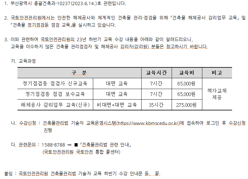 Çѱ¹°Ç¼³¿£Áö´Ï¾î¸µÇùȸ¿¡¼ ¾Ë·Áµå¸³´Ï´Ù.| ºÎ»ê½Ã, °ÇÃ๰ Á¤±âÁ¡ µî Á¡°ËÀÚ ¹× ÇØÃ¼°ø»ç °¨¸®ÀÚ ±³À° ½Ç½Ã ¾È³» |