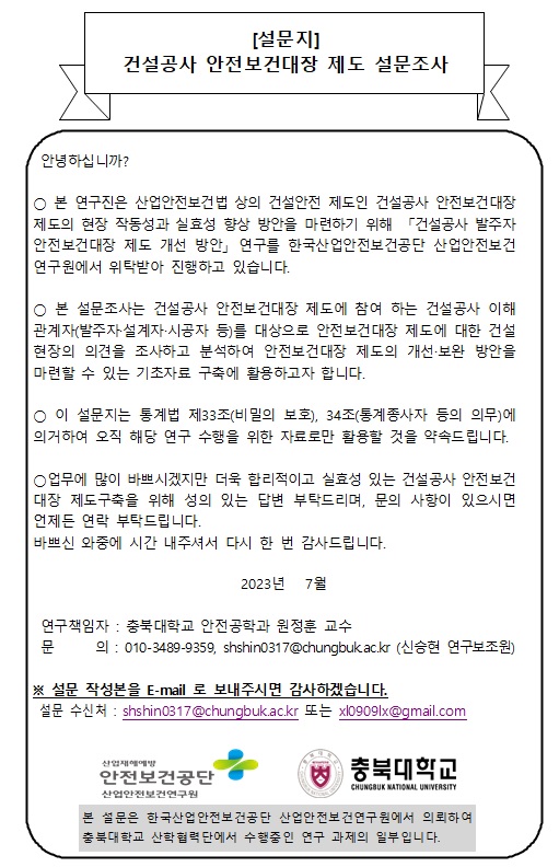 Çѱ¹°Ç¼³¿£Áö´Ï¾î¸µÇùȸ¿¡¼ ¾Ë·Áµå¸³´Ï´Ù.| ÃæºÏ´ë, °Ç¼³°ø»ç¹ßÁÖÀÚ ¾ÈÀüº¸°Ç´ëÀå Á¦µµ °³¼±¹æ¾È °ü·Ã ¼³¹®Á¶»ç ÇùÁ¶¿äû |