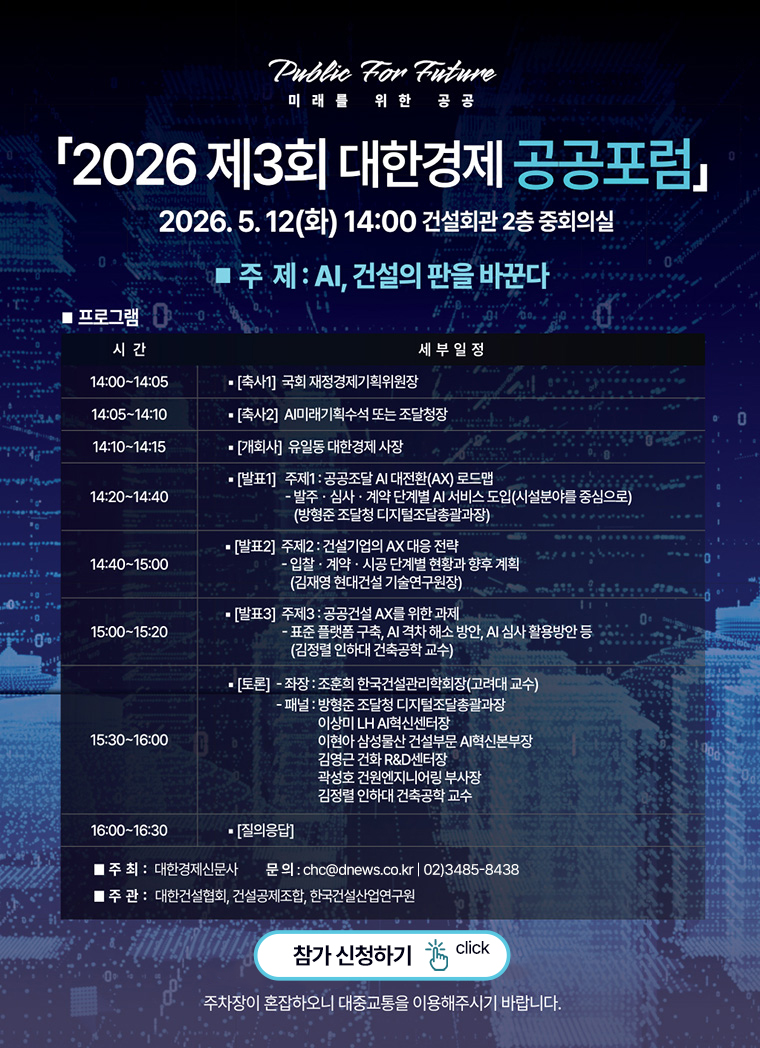 ´ëÇѰæÁ¦¿¡¼ ¡®2026³â Á¦3ȸ ´ëÇѰæÁ¦ °ø°øÆ÷·³¡¯À» ¾Æ·¡¿Í °°ÀÌ °³ÃÖ ÇÏ¿À´Ï Âü°íÇÏ¿© Áֽñ⠹ٶø´Ï´Ù. -¾Æ ·¡- ¢¹ÀϽà : 2026³â 5¿ù12ÀÏ(È) ¿ÀÈÄ 2½Ã ¢¹Àå¼Ò : ¼¿ï ³íÇöµ¿ °Ç¼³È¸°ü 2Ãþ ÁßȸÀÇ½Ç ¢¹ÁÖÁ¦ : AI, °Ç¼³ÀÇ ÆÇÀ» ¹Ù²Û´Ù ¢¹ÁÖÃÖ : ´ëÇѰæÁ¦½Å¹®»ç ¢¹ÁÖ°ü : ´ëÇѰǼ³Çùȸ, °Ç¼³°øÁ¦Á¶ÇÕ, Çѱ¹°Ç¼³»ê¾÷¿¬±¸¿ø ¢¹ÈÄ¿ø : °¢ °Ç¼³´Üü ¹× °ø±â¾÷, °Ç¼³±â¾÷ µî ¢¹Âü°¡: https://docs.google.com/forms/d/e/1FAIpQLSdr37wttdC8HxFrUf7gnOsgQ7kIaXmcLblZdDw1Pg3Gjbi5fw/viewform ¢¹¹®ÀÇ: (02)3485-8496, 8488 |