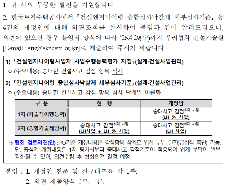 Çѱ¹°Ç¼³¿£Áö´Ï¾î¸µÇùȸ¿¡¼ ¾Ë·Áµå¸³´Ï´Ù.| LH,¡¸°Ç¼³eng. Á¾Çսɻ糫ÂûÁ¦ ¼¼ºÎ½É»ç±âÁØ¡¹°³Á¤¾È(4°Ç) ÀǰßÁ¶È¸ |
