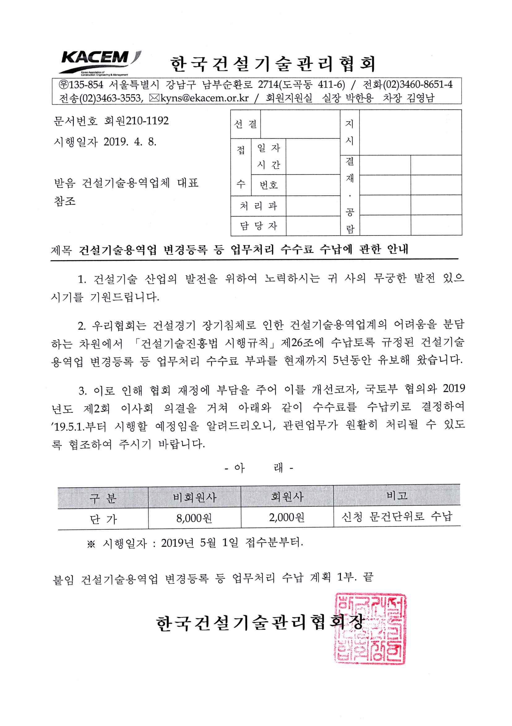 Çѱ¹°Ç¼³¿£Áö´Ï¾î¸µÇùȸ¿¡¼ ¾Ë·Áµå¸³´Ï´Ù.| °Ç¼³±â¼ú¿ë¿ª¾÷ º¯°æµî·Ï µî ¾÷¹«Ã³¸® ¼ö¼ö·á ¼ö³³¿¡ °üÇÑ ¾È³» |