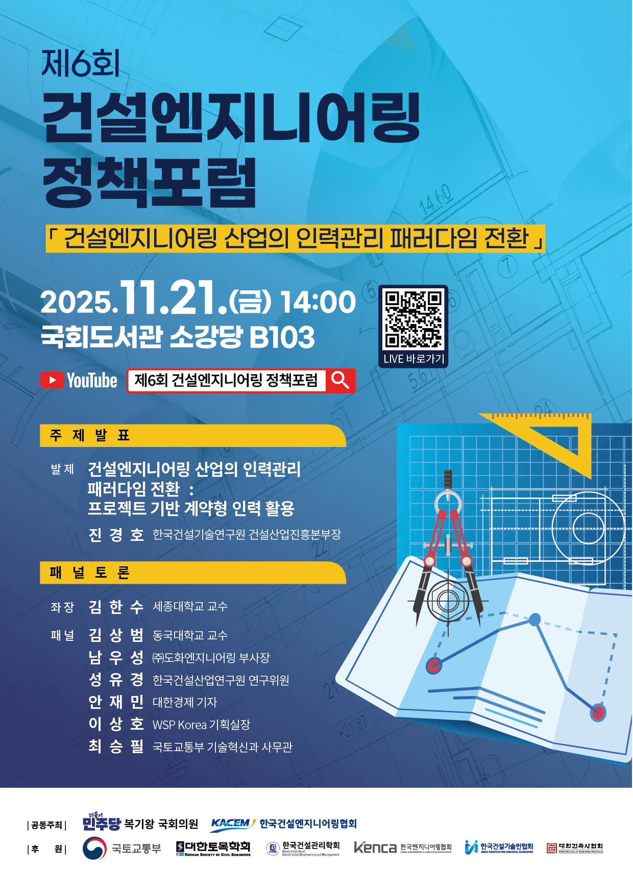 À¯Æ©ºê »ýÁß°è °ü·Ã ÇÏ´ÜÀÇ ¹Ù·Î°¡±â Ŭ¸¯ https://youtube.com/live/VuV5MazL6s4?feature=share 1. ±Í »çÀÇ ¹«±ÃÇÑ ¹ßÀüÀ» ±â¿øÇÕ´Ï´Ù. 2. ¿ì¸®Çùȸ´Â º¹±â¿Õ ±¹È¸ÀÇ¿ø(´õºÒ¾î¹ÎÁÖ´ç/±¹Åä±³ÅëÀ§¿øÈ¸)°ú °øµ¿À¸·Î, °Ç¼³¿£Áö´Ï¾î¸µ»ê¾÷ÀÇ ÁÖ¿ä Çö¾È°ú ¹®Á¦Á¡À» °øÀ¯ÇÏ°í »ê¡¤ÇС¤¿¬¡¤°ü °ü°èÀü¹®°¡µéÀÇ ½Éµµ ÀÖ´Â Åä·ÐÀ» ÅëÇØ Áö¼Ó °¡´ÉÇÑ ¹ßÀüÀü·«À» ³íÀÇÇϰíÀÚ Á¦6ȸ¡¸°Ç¼³¿£Áö´Ï¾î¸µ Á¤Ã¥Æ÷·³¡¹À» °³ÃÖÇÕ´Ï´Ù. 3. ÀÌ¿¡, ÇØ´ç Æ÷·³ °³ÃÖ°èȹÀ» ´ÙÀ½°ú °°ÀÌ ¾È³»ÇÏ¿À´Ï, ¸¹Àº ºÐµéÀÇ Àû±ØÀûÀÎ °ü½É°ú Âü¿©¸¦ ¿äûµå¸®¸ç, ºÙÀÓ¿¡ µû¸¥ Âü¼® Å뺸¼¸¦ ¡¯25.11.14(±Ý)±îÁö ¿ì¸®Çùȸ °Ç¼³±â¼ú½Ç(eng@ekacem.or.kr)·Î ¼ÛºÎÇÏ¿© ÁÖ½Ã¸é °¨»çÇϰڽÀ´Ï´Ù. - ´Ù À½ - °¡. ÀÏ ½Ã : 2025.11.21(±Ý), 14:00 ~ 16:00 ³ª. Àå ¼Ò : ±¹È¸µµ¼°ü ¼Ò°´ç B103 (¿©Àǵµ ±¹È¸ÀÇ»ç´ç) ´Ù. Âü¼®´ë»ó : °Ç¼³¿£Áö´Ï¾î¸µ »ê¾÷ °ü°èÀÚ ¾à 60¸í ¶ó. ÁÖ Á¦ :¡¸°Ç¼³¿£Áö´Ï¾î¸µ »ê¾÷ÀÇ Àη°ü¸® ÆÐ·¯´ÙÀÓ Àüȯ : À¯¿¬ÇÑ ÇÁ¸®·£¼¡¤°è¾àÇü Àη ¿î¿µ µîÀ» Áß½ÉÀ¸·Î¡¹ ¸¶. ÇÁ·Î±×·¥ : ¡°ºÙÀÓ ÂüÁ¶¡± ºÙÀÓ 1. Á¦6ȸ¡¸°Ç¼³¿£Áö´Ï¾î¸µ Á¤Ã¥Æ÷·³¡¹°³ÃÖ°èȹ(Æ÷½ºÅÍ) 1ºÎ. 2. Âü°¡ ½Åû¼ 1ºÎ. ³¡.