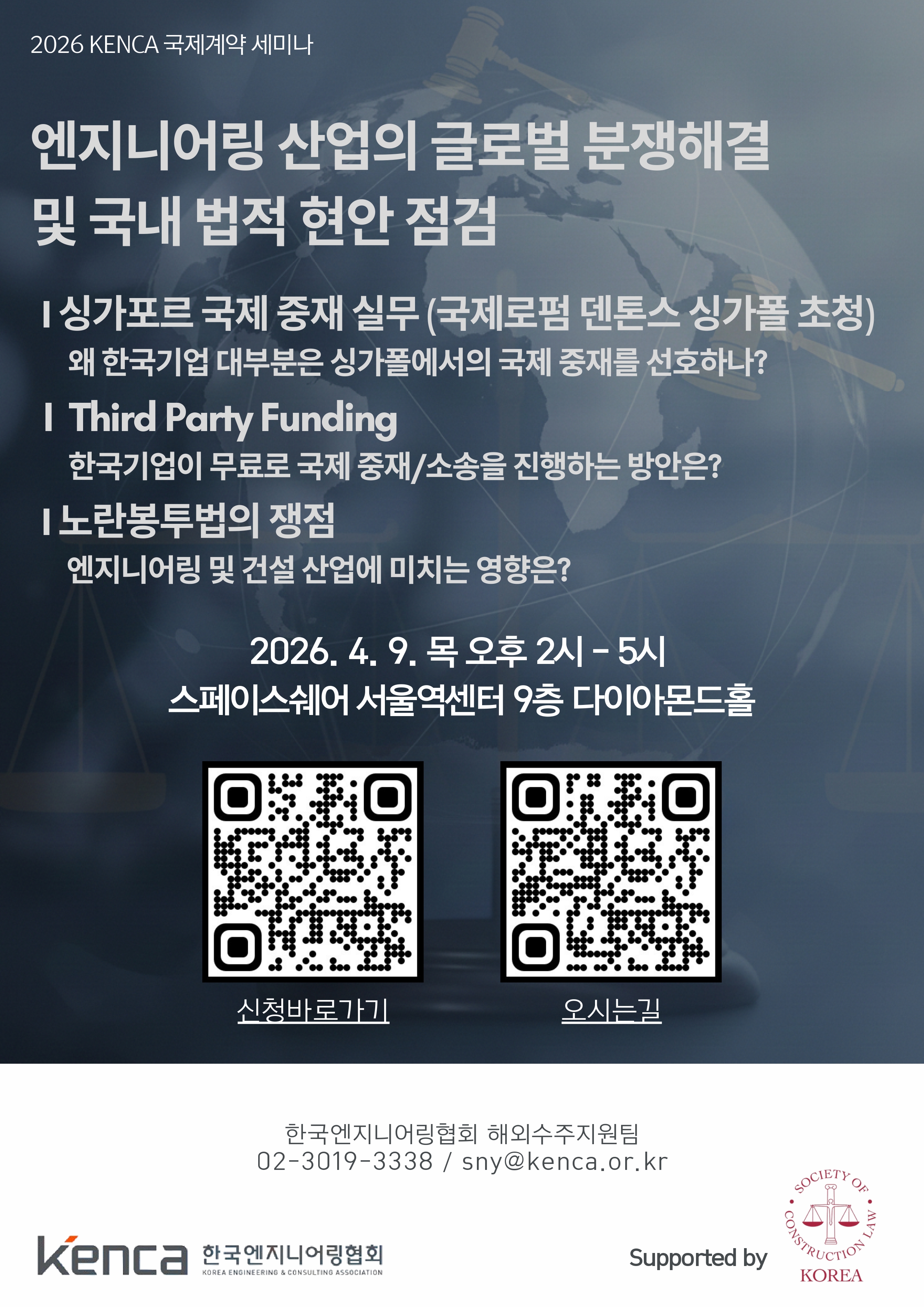 Çѱ¹¿£Áö´Ï¾î¸µÇùȸ¿¡¼ ±¹³»¿Ü ȯ°æ º¯È¿¡ ¹ß¸ÂÃß¾î, ±¹³» ±â¾÷ÀÇ ¼º°øÀûÀÎ ÇØ¿Ü ÁøÃâ ¹× ºÐÀï ÇØ°á Àü·«À» ¸ð»öÇÏ°í ±¹³» ¹ýÀû Çö¾ÈÀ» Á¡°ËÇϱâ À§ÇÑ ¡¸2026 KENCA ±¹Á¦°è¾à ¼¼¹Ì³ª¡¹¸¦ ¾Æ·¡¿Í °°ÀÌ °³ÃÖÇÏ¿À´Ï ¸¹Àº °ü½É ºÎʵ右´Ï´Ù. - ¾Æ ·¡ - 1. Çà »ç ¸í : 2026 KENCA ±¹Á¦°è¾à ¼¼¹Ì³ª 2. ÁÖ Á¦ : ¿£Áö´Ï¾î¸µ»ê¾÷ÀÇ ±Û·Î¹ú ºÐÀï ÇØ°á ¹× ±¹³» ¹ýÀû Çö¾È Á¡°Ë ¡Ø ¼¼ºÎ³»¿ë ¹× Âü¿© ¿¬»ç ºÙÀÓÆÄÀÏ ÂüÁ¶ 3. ÀÏ ½Ã : 2026. 4. 9. (¸ñ), ¿ÀÈÄ 2½Ã - 5½Ã 4. Àå ¼Ò : ½ºÆäÀ̽º½¦¾î ¼¿ï¿ª ¼¾ÅÍ 9Ãþ ´ÙÀ̾ƸóµåȦ 5. ¹® ÀÇ : Çѱ¹¿£Áö´Ï¾î¸µÇùȸ ÇØ¿Ü¼öÁÖÁö¿øÆÀ ¼Û³ª¿µ ´ë¸® * 02-3019-3338 / sny@kenca.or.kr |