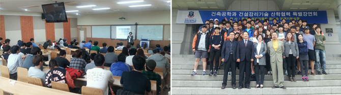 ¿ì¸®Çùȸ´Â Áö³ 5¿ù 28ÀÏ °æµ¿´ëÇб³ °Àǽǿ¡¼ °æµ¿´ëÇб³ °ÇÃà°øÇаú Çлý 100¿©¸íÀÌ Âü¼®ÇÑ °¡¿îµ¥ ¡°°ÇÃà°øÇаú °Ç¼³°¨ ¸®±â¼ú »êÇÐÇù·Â Ưº°°¿¬È¸¡±¸¦ ÁøÇàÇß´Ù. °¨¸®Á¦µµ ¹× ±â¼ú µî Àü¹ÝÀûÀÎ °¨¸®¾÷¹«¿¡ ´ëÇØ ÇлýµéÀÇ ÀÌÇØ¸¦ µ½°íÀÚ ÁøÇàµÈ À̹ø Çà»ç´Â °æµ¿´ëÇб³ °ÇÃà°øÇаú ÀÌ¿µµµ ±³¼öÀÇ ¿äû¿¡ ÀÇÇØ ¸¶·ÃµÆ´Ù. ¿ì¸®Çùȸ ȲÀ̼÷ ±âȹº»ºÎÀåÀÌ À̳¯ °»ç·Î ÃʺùµÇ¾î °Ç¼³°¨¸®Á¦µµ Àü¹Ý¿¡ ´ëÇÑ ¼³¸í°ú ´õºÒ¾î °¨¸®Á¦µµÀÇ Çʿ伺°ú ½ÇÈ¿¼º, ¾ÕÀ¸·Î °Ç¼³±â¼ú¿ë¿ª¾÷ÀÇ ±¸Á¶º¯È µîÀ» ÁÖÁ¦·Î °ÀǸ¦ ÁøÇàÇÏ¿´´Ù. ÇлýµéÀº °¨¸®¾÷¹« Àü¹Ý¿¡ ´ëÇÑ ÀÌÇØ´Â ¹°·Ð °Ç¼³°¨¸® Áö ½ÄÀ» ÇÔ¾ç½Ã۴µ¥ Å« µµ¿òÀ» ¹Þ¾Ò´Ù´Â Æò°¡¸¦ ÇÏ¿´À¸¸ç ƯÈ÷ °Ç¼³±â¼ú¿ë¿ª¾÷ÀÇ º¯È¿¡ ´ëÇØ Å« °ü½ÉÀ» º¸¿´´Ù. À̳¯ °ÀǸ¦ µéÀº ÇÑ ÇлýÀº ¡°¿À´Ã °ÀǸ¦ ÅëÇØ °¨¸®ÀÇ Á߿伺À» È®ÀÎÇÏ´Â ÇÑÆí, Ã¥¿¡¼ ¹è¿ï ¼ö ¾ø¾ú´ø ½Ç¹«ÀûÀÎ ³»¿ëÀ» ¹è¿ï ¼ö ÀÖ¾î ¶æ ±íÀº ½Ã°£À̾ú´Ù.¡±´Â ¼Ò°¨À» ¹àÇû´Ù. ¿ì¸®Çùȸ´Â Çѱ¹°ÇÃà½Ã°øÇÐȸ, °æ±â´ëÇб³, ¼¿ï°úÇбâ¼ú´ëÇб³ µî°ú »óÈ£Çù·Â Çù¾à(MOU)¸¦ ü°áÇÏ¿© »ê¤ýÇÐ °øµ¿¹ßÀü°ú °Ç ¼³°ü·Ã ¿ì¼öÀη ¾ç¼º µîÀ» µµ¸ðÇϰí ÀÖÀ¸¸ç, °Ç¼³°¨¸®Á¦µµÀÇ ½ÇÈ¿¼º ÀüÆÄ¸¦ À§Çؼµµ Áö¼ÓÀûÀ¸·Î ³ë·ÂÀ» ±â¿ïÀ̰í ÀÖ´Ù. |